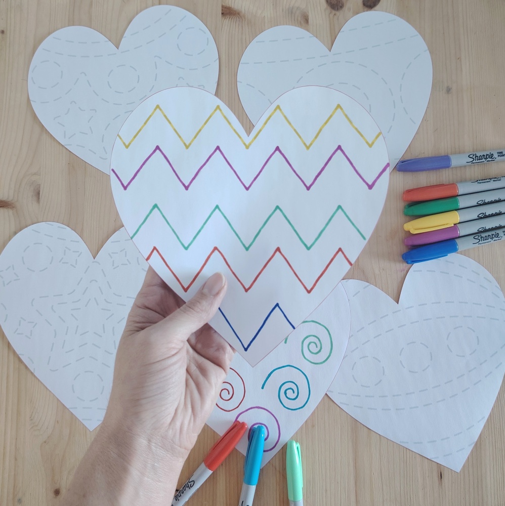Plik pdf zawiera 12 plansz w ksztalcie serduszka ze szlaczkami