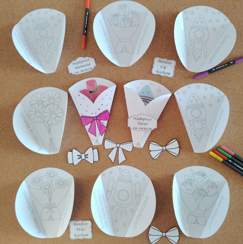 Plik pdf zawiera 24 wzory laurek, kokardki oray plakierki z napisami